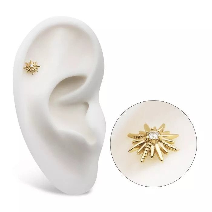 This is a 14 Karat Gold, threadless sunburst top featuring a prong set lab grown diamond. This would look stunning in helix, lobe and conch piercings.
