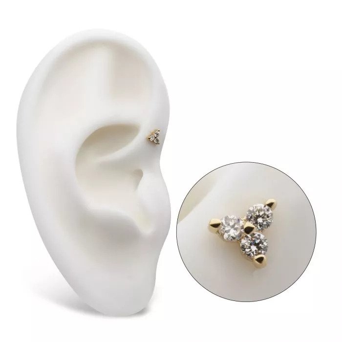 This is a 14Kt Gold Trinity lab grown diamond top from Invictus. It's the perfect piece for those who want style and quality. This is perfect for most piercings such as lobes, helix, forward helix, conch, tragus, and nostril piercings.
