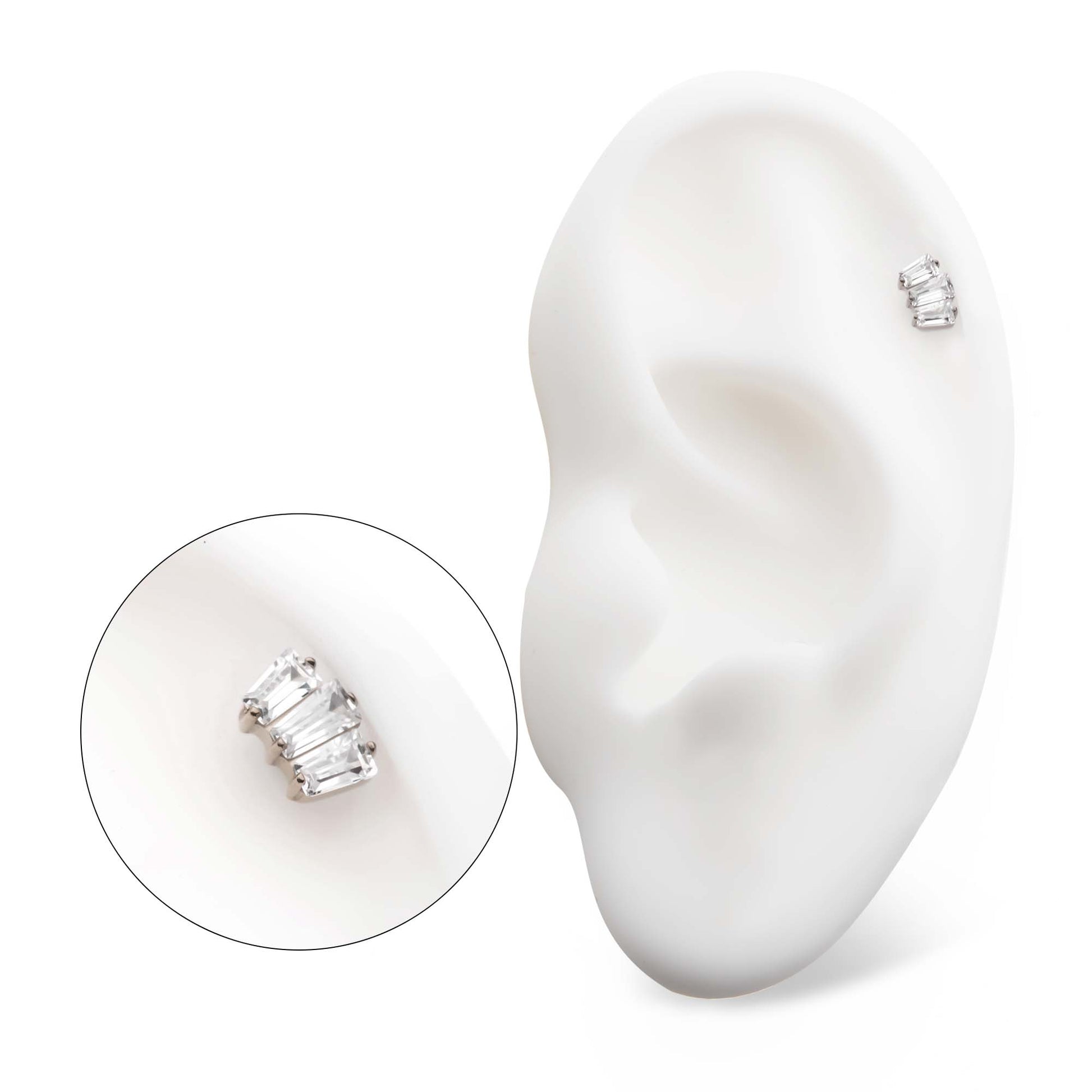 Internally Threaded Prong Set Baguette CZ Cluster Top. Manufactured from High Polish Implant Grade Titanium (Ti-6AL-4V-ELI ASTM F136).
