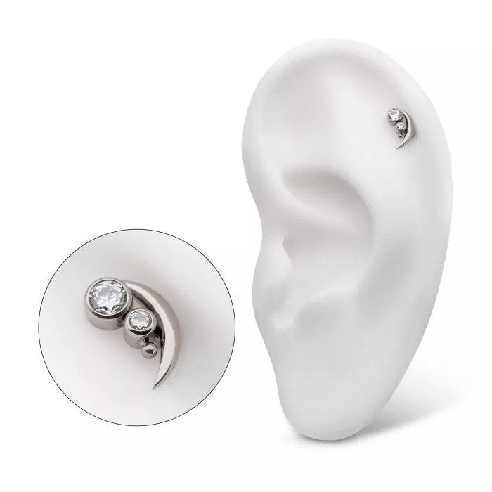 This internally threaded crescent moon features bezel set cz gemstones and a titanium bead. This would fit nicely in most helix, tragus or conch piercings.