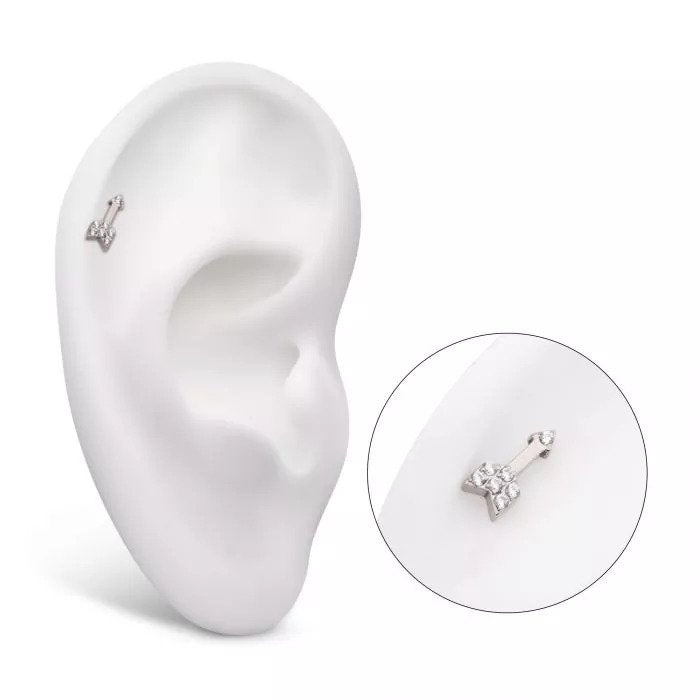 This internally threaded pave set, brilliant cut CZ gem arrow top is manufactured from high polish implant grade titanium. This top would fit nicely in helix, lobe, conch and tragus piercings.
