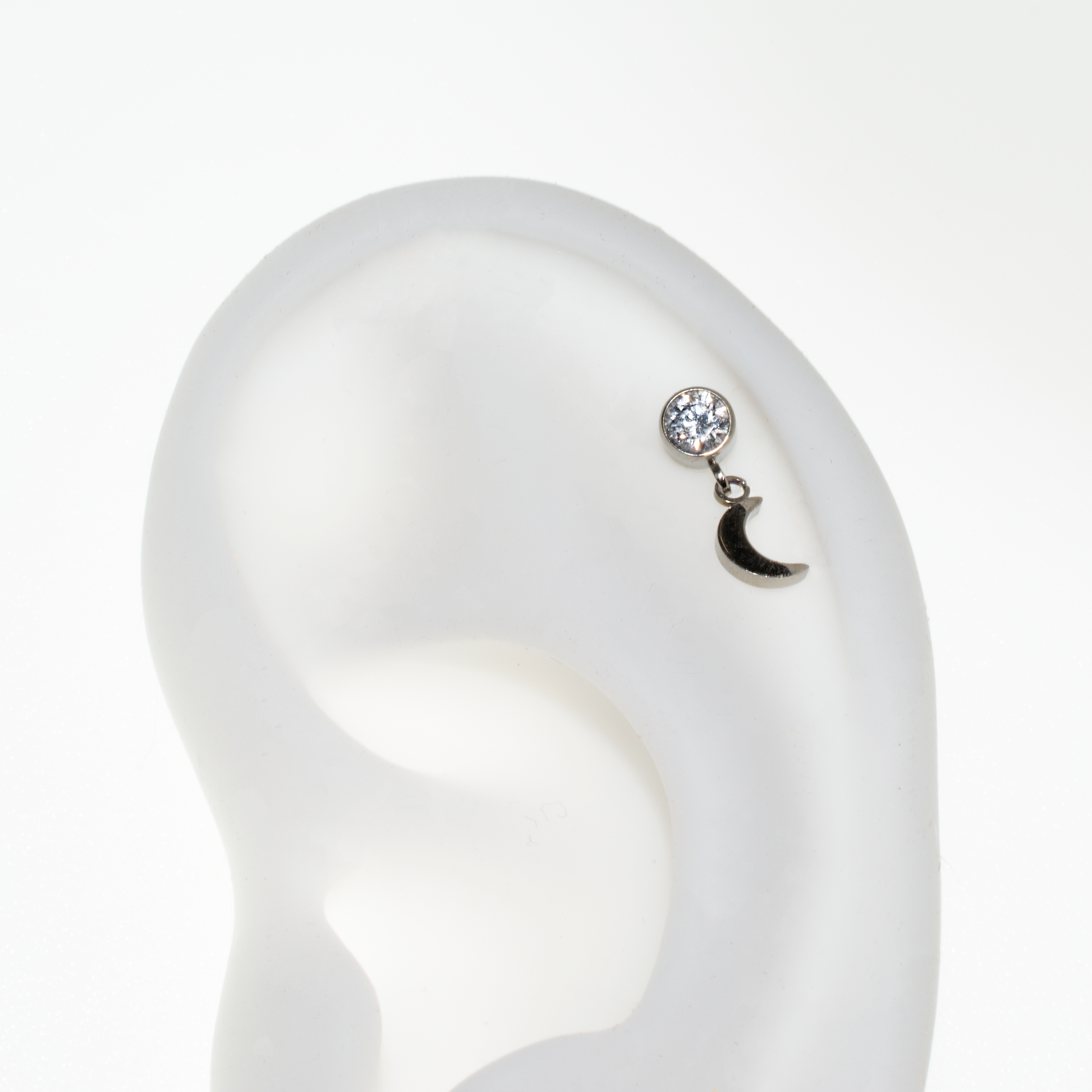 This is an Internally Threaded Bezel Set CZ with Dangling Crescent Moon Top. It is made from implant-grade titanium and is perfect for lobe and helix piercings.