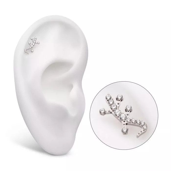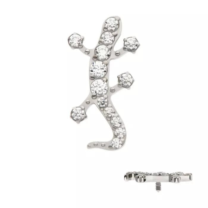 This is an internally threaded pave set round CZ gem Lizard Top which is manufactured from high polish implant grade titanium. This would fit nicely in lobe or helix piercings.