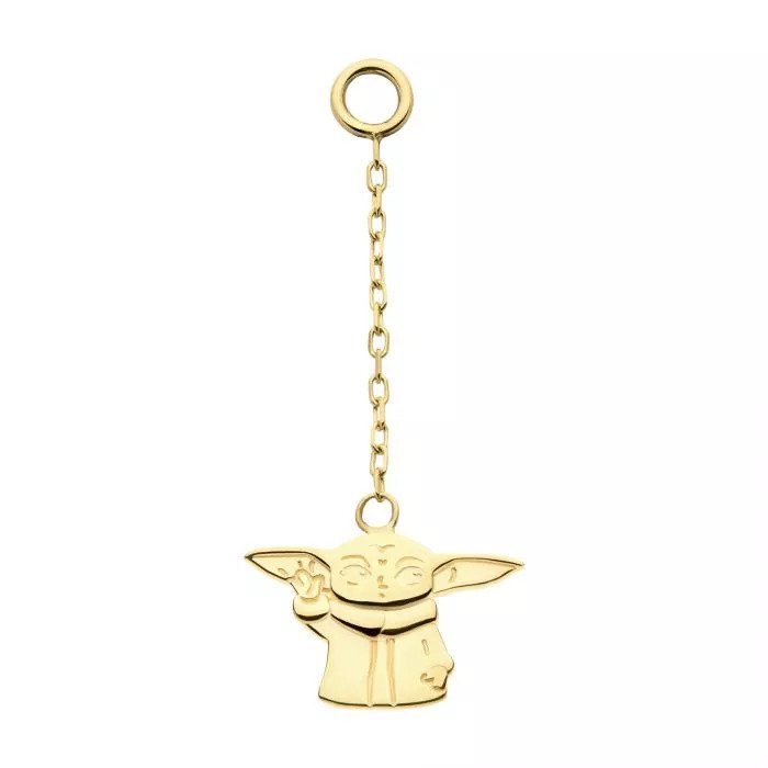 This is a Star Wars - Grogu Dangle Charm, made of 14kt nickel-free Yellow Gold. This is perfect fitted on a hinge ring in a lobe piercing.