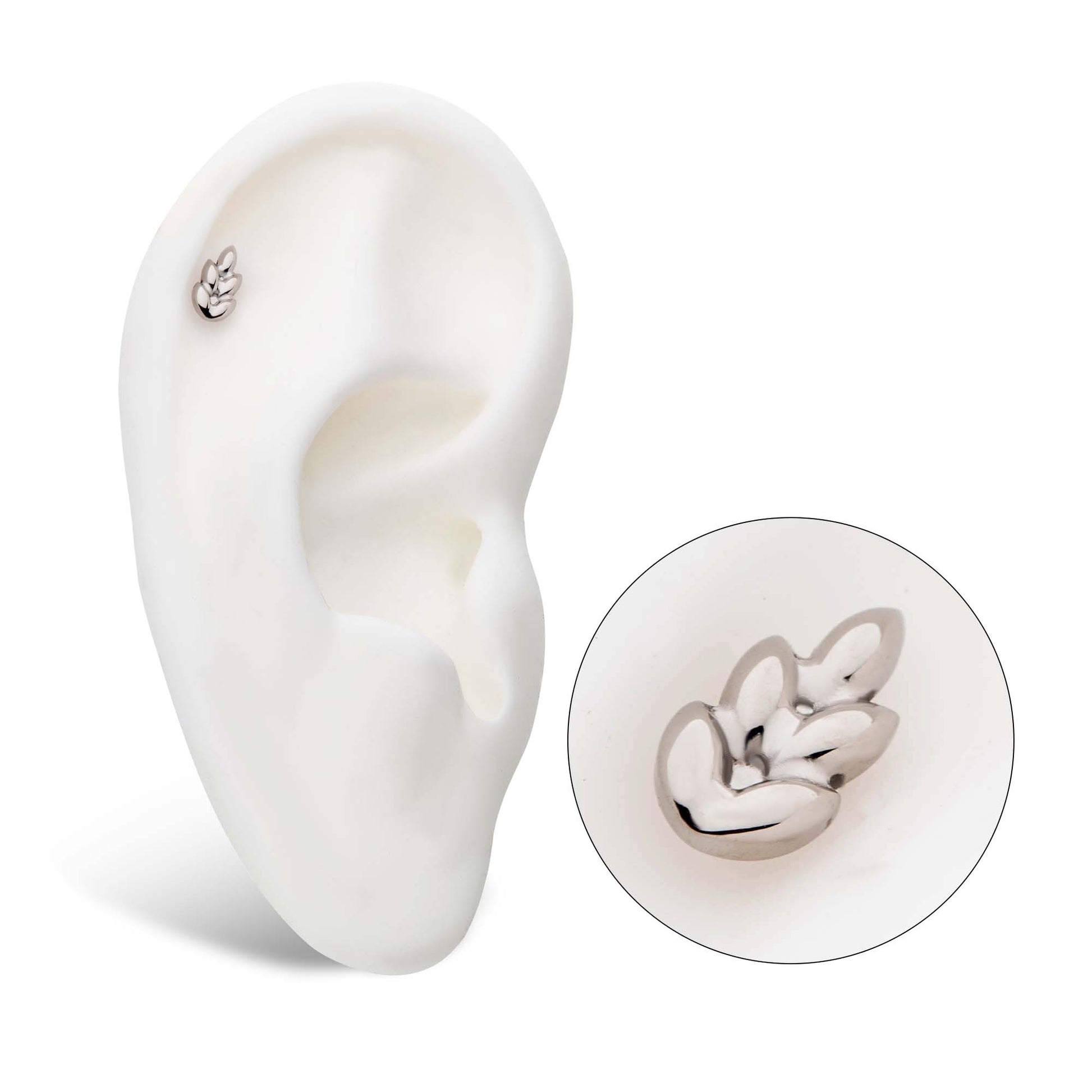 This is our Internally Threaded Leaf Top. It is made from High Polish Implant Grade Titanium and is perfect for many ear piercings such as helix, lobes, and conch.