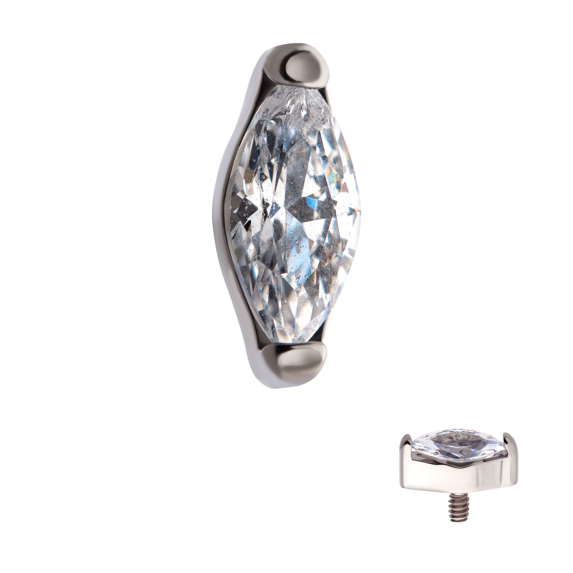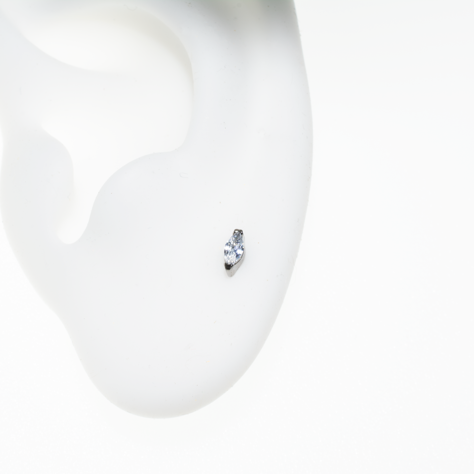 This little marquise cubic zirconia is set with two prongs, it is made from implant grade titanium and is internally threaded. This piece of jewellery is perfect for piercings such as lobes, helix, tragus, and conch.