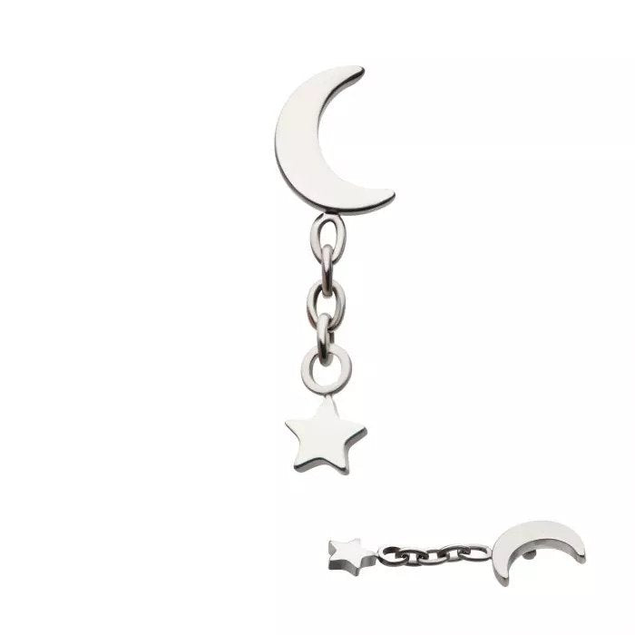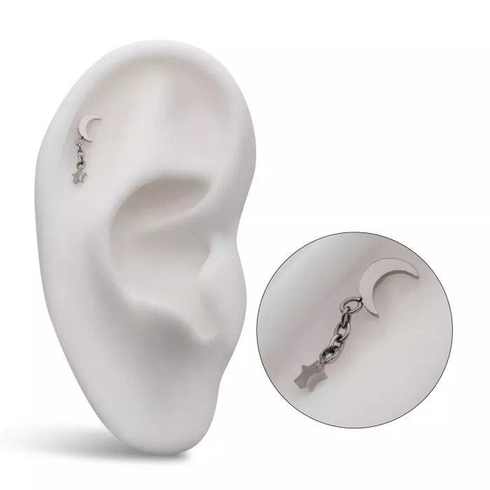 This is an internally threaded Crescent Moon Top with a Dangle Star which is manufactured with high polish implant grade titanium. It would fit nicely in helix and lobe piercings as well as some others.