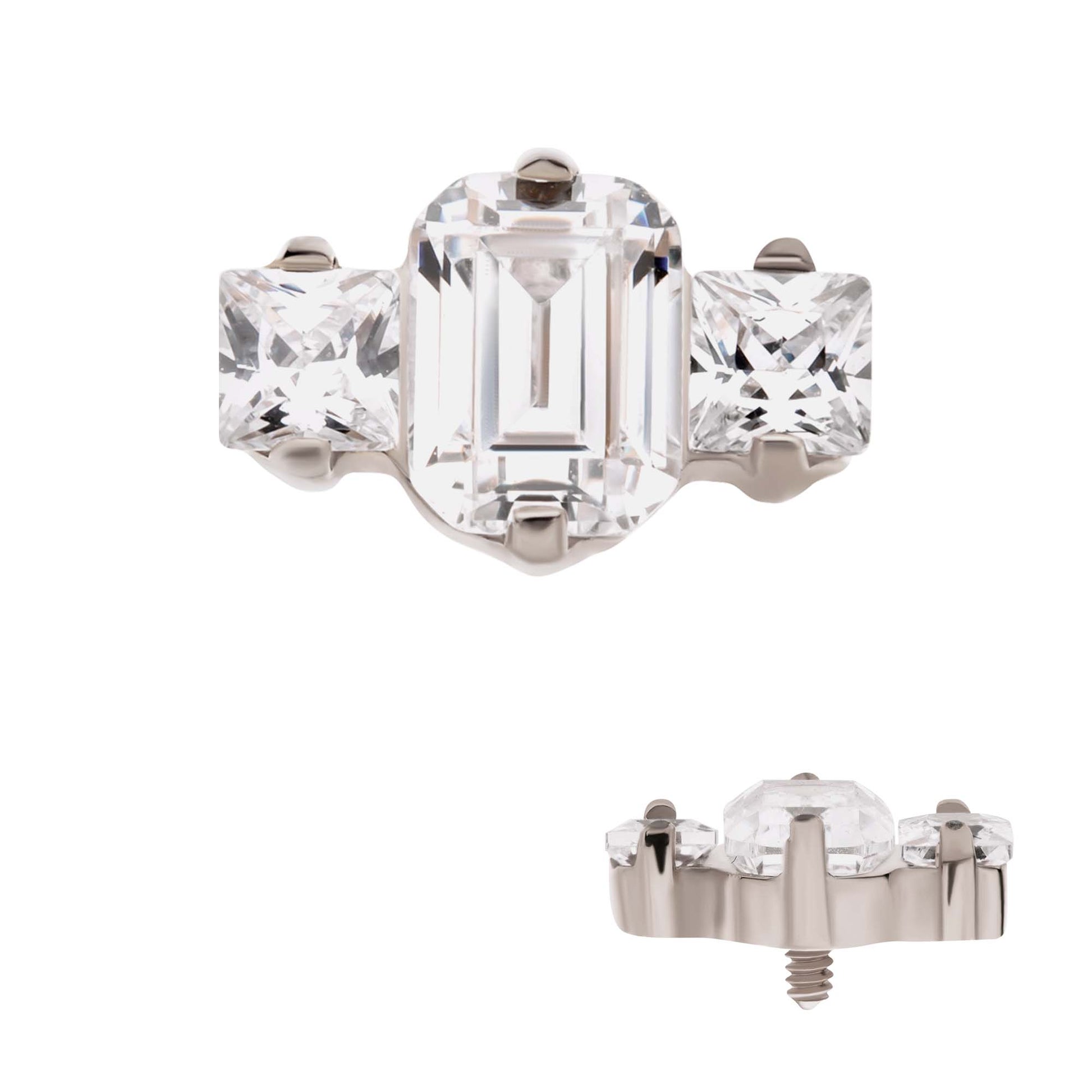 This Prem Cluster top is internally threaded; features prong set Emerald and Square cut CZ gemstones and is manufactured from high polish Implant Grade titanium.