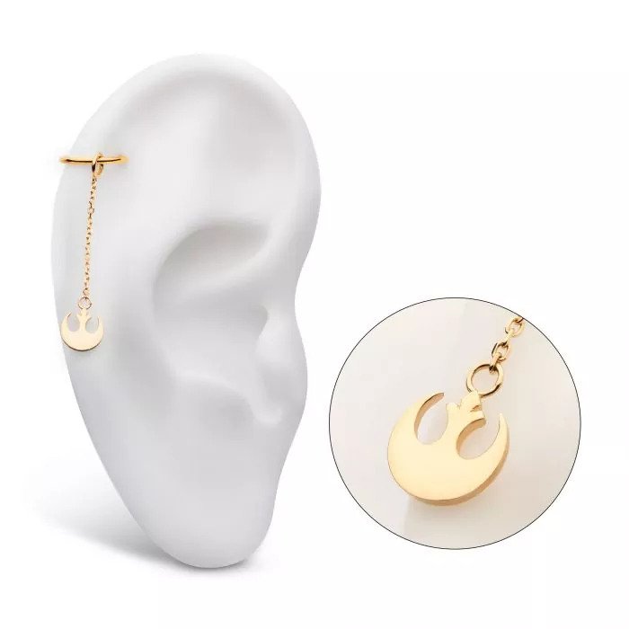 This is a 14 karat, nickel-free gold jedi charm from our licensed Star Wars collection. It can be fitted onto our hinge rings and worn in lobe piercings.