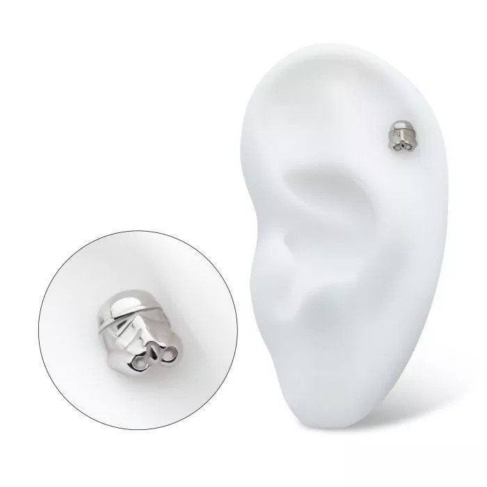 This is a 14 karat, nickel-free white gold storm trooper top from our licensed Star Wars collection. It has an implant grade steel pin designed to be practical and easy to use with our threadless posts. These look fantastic in lobes and even some conch or helix piercings!