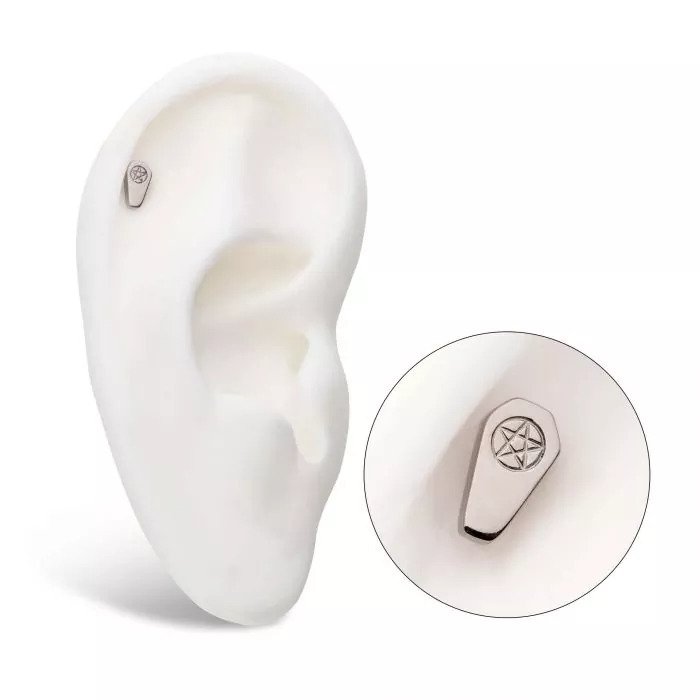 Internally Threaded Coffin with Engraved Pentagram. Manufactured from High Polish Implant Grade Titanium (Ti-6AL-4V-ELI ASTM F136).